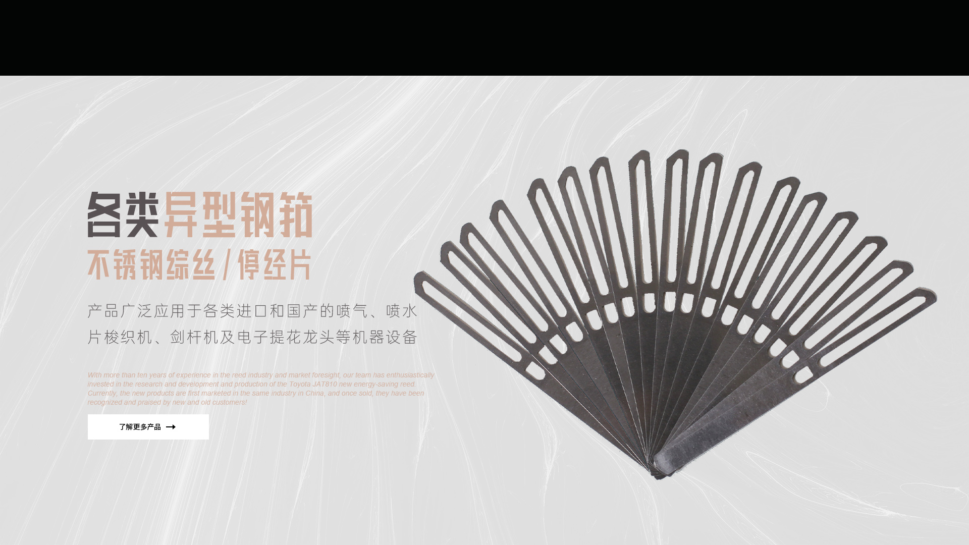 憑借十多年鋼筘行業(yè)經(jīng)驗(yàn)及對市場的前瞻性,我們團(tuán)隊(duì)滿懷熱情的投入到豐田JAT810新型節(jié)能鋼筘的研發(fā)和生產(chǎn)當(dāng)中,目前新產(chǎn)品在國內(nèi)同行業(yè)中先行上市銷售,一經(jīng)銷售就得到了新老客戶的認(rèn)可和好評!